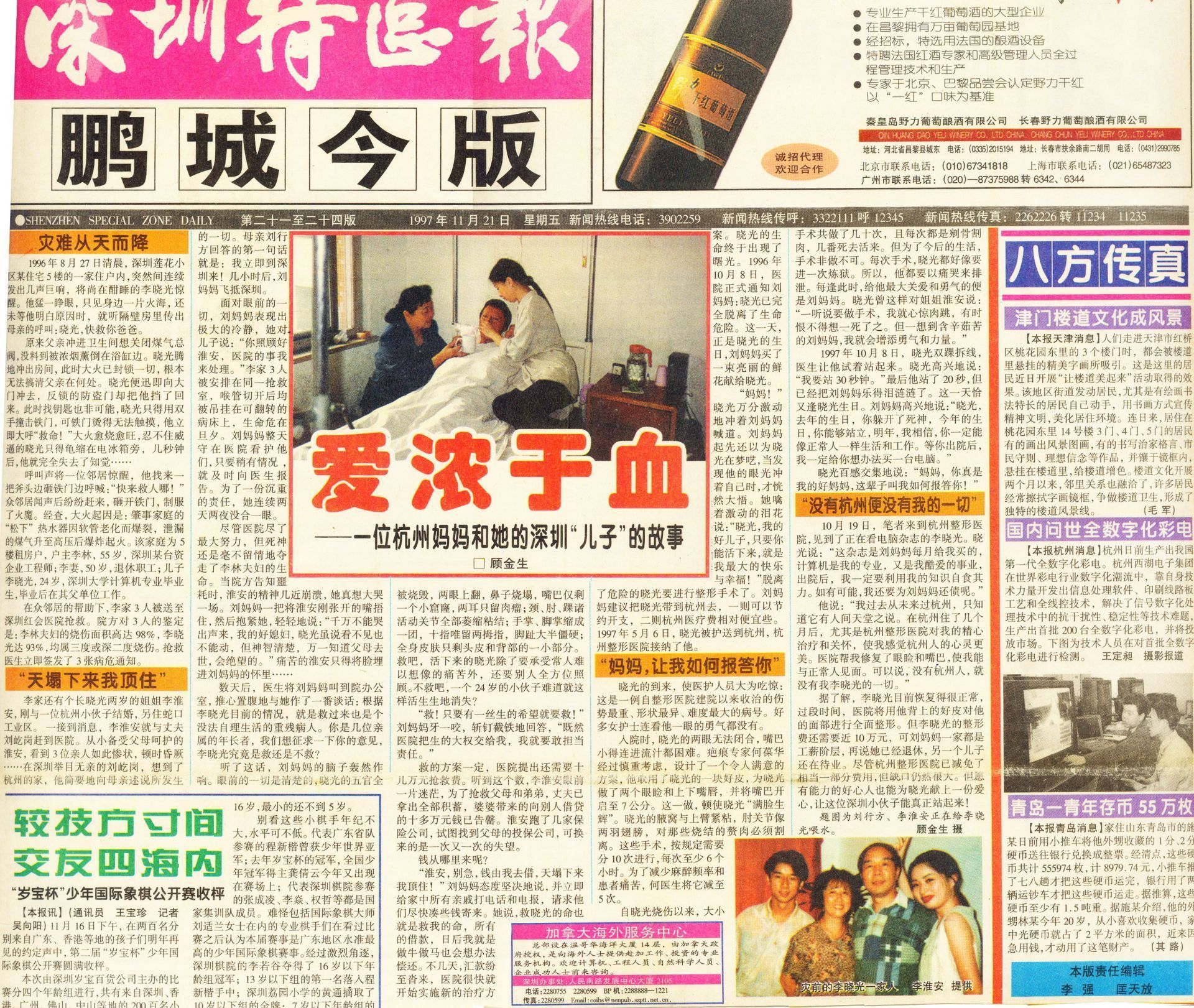 李曉光至今還留著一張報紙,他珍惜地把它過膠塑封,保存在身邊。那是《深圳特區報》1997年11月21日刊登的一篇報道《愛濃于血——一位杭州媽媽和她的深圳“兒子”的故事》,報道的正是他當年在杭州醫院做整形手術時的經歷。