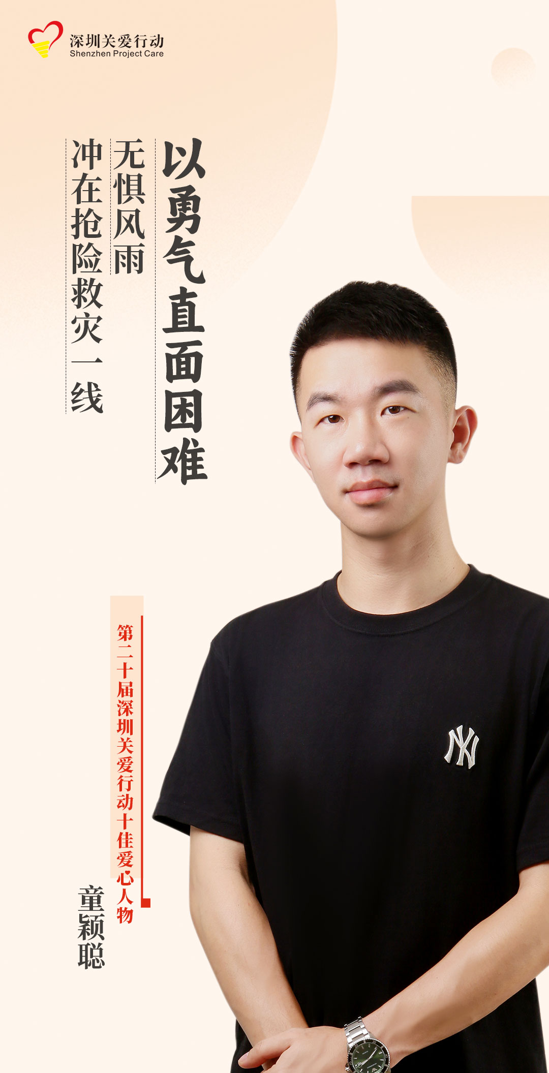 童穎聰積極主動參與了河南、英德、河源等地的應急搶險救災工作,多次受領救援當地政府感謝信和錦旗。2021年,在河南防汛搶險救災期間,他個人操舟艇轉移受困群眾280余名,帶領30人組成的救援隊累計轉移受困群眾超700名。2022年,在英德遭遇特大洪水期間,他帶隊累計轉移群眾300名,協助發放物資1800份。童穎聰也因此獲得了2022年度深圳市“最美應急人”榮譽稱號。