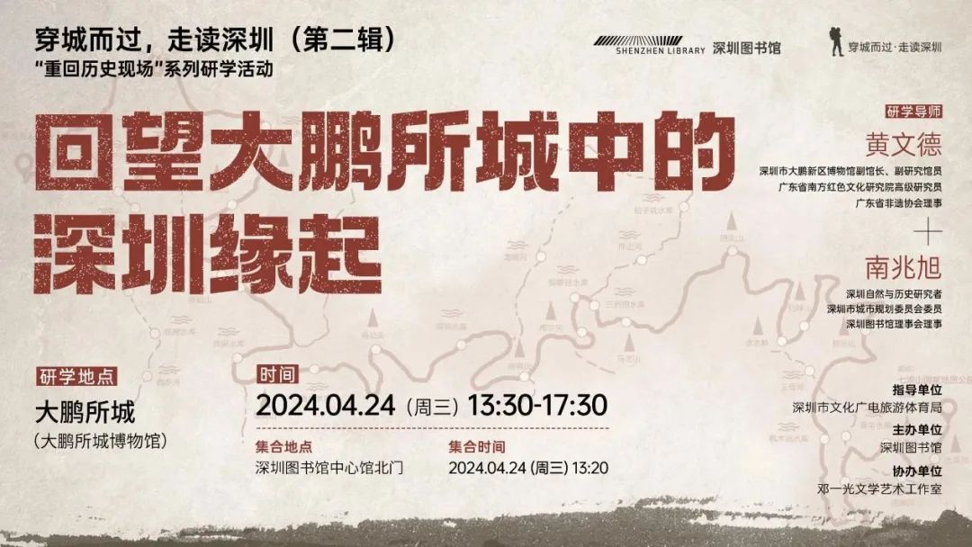 活動簡介:在4月23日“世界讀書日”及公共圖書館服務宣傳周期間,深圳圖書館將舉辦“穿城而過,走讀深圳”第二輯“重回歷史現場”系列研學活動。本次研學以深圳海防為行走主線,帶領市民讀者走進百年古城,觸摸大鵬所城人文景觀,回望深圳抵御外侮抗戰歷史。