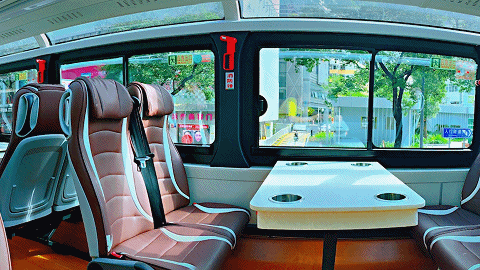 柔軟皮質(zhì)座椅、4人小方桌,二層全景大天窗將質(zhì)感拉滿;配套的變色玻璃及透明投影膜技術(shù),還有8國(guó)語言講解器,讓旅游觀光和沿途學(xué)習(xí)兩不誤!