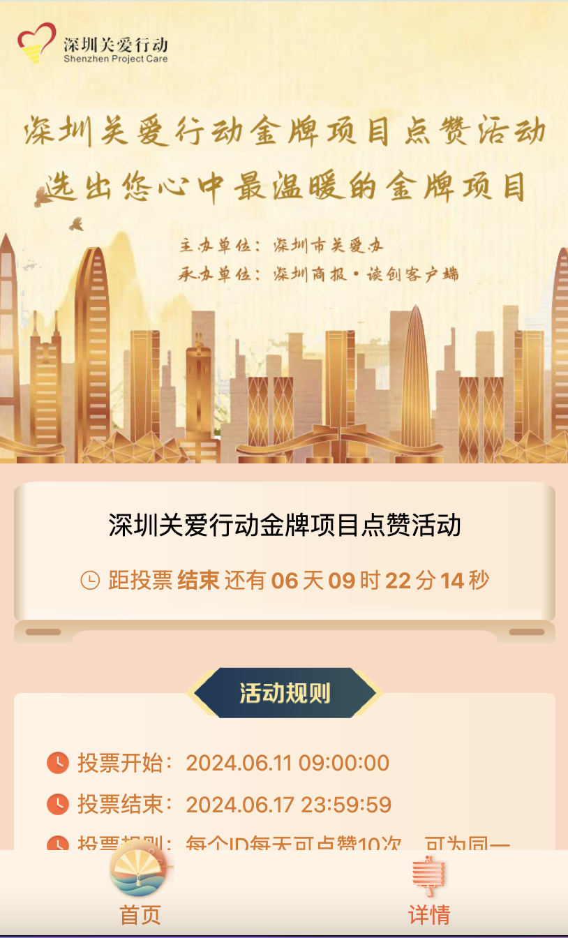為推廣這些充滿溫情的關(guān)愛項(xiàng)目,進(jìn)一步激發(fā)社會各界參與關(guān)愛行動的熱情,共同推動深圳關(guān)愛行動向更高水平發(fā)展,深圳市關(guān)愛辦于今日(2024年6月11日)正式啟動了“深圳關(guān)愛行動金牌項(xiàng)目”點(diǎn)贊活動。