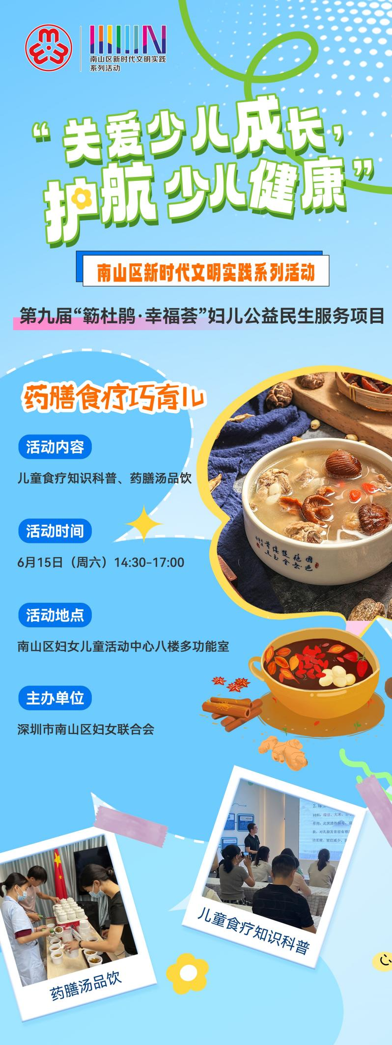 活動簡介:藥膳,既有果腹之用,亦有保健之功,兼具療疾之效。“寓醫于食”,藥借食力,食助藥威。根據不同氣候、個人體質差異選擇相應的藥材和食材進行煲制達到改善體質、滋補保健的目的。本次活動不僅有兒童膳食營養專業指導,更有美味藥膳湯品現場品嘗,快來報名,一起踏上藥膳世界的探索之旅吧!