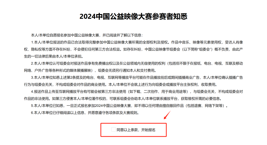 注:請仔細(xì)閱讀《2024中國公益映像大賽參賽者知悉》,同意相關(guān)條款后填寫電子報(bào)名表,并按表內(nèi)要求上傳相應(yīng)證明文件。