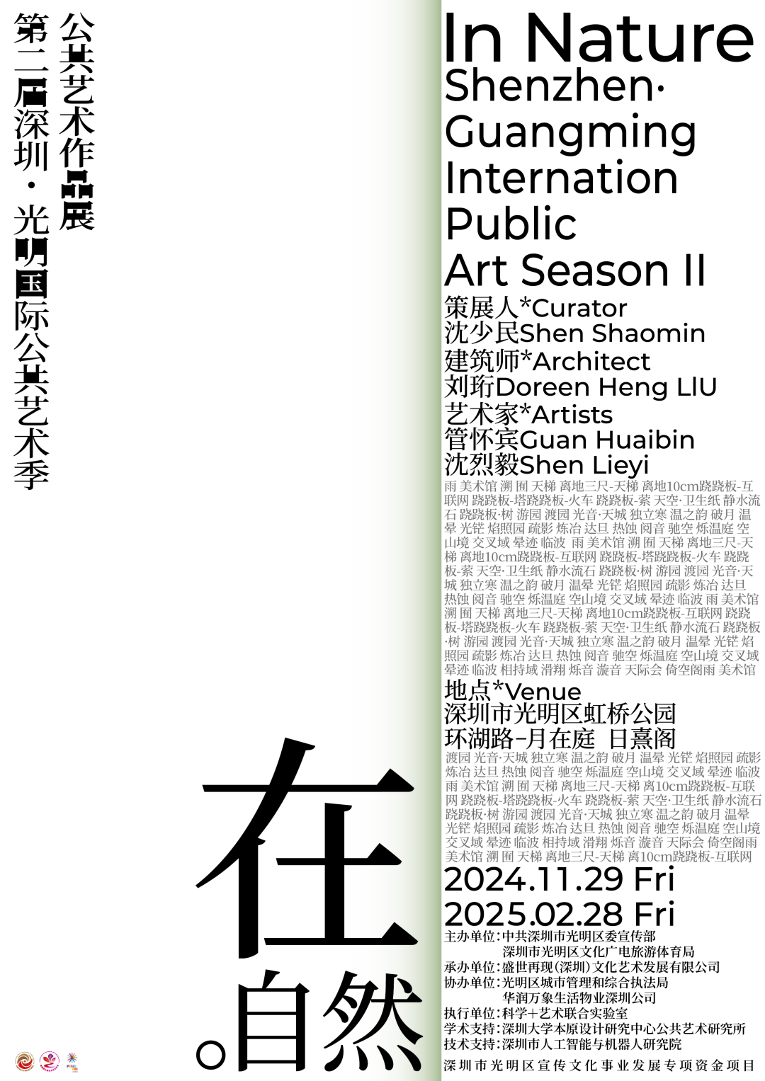 活動簡介:第二屆深圳·光明國際公共藝術季「在·自然」公共藝術作品展將于11月29日在光明區虹橋公園的月在庭與日熹閣舉辦。“在·自然”公共藝術作品展旨在探討建筑與自然、人與自然以及自然與自身之間的深層關系,通過多種媒介和形式的公共藝術作品,呈現這些關系在不同緯度和層面的表現。展覽強調自然的多樣性和復雜性,探索在當代背景下如何重新理解和構建人類與自然的共生關系。