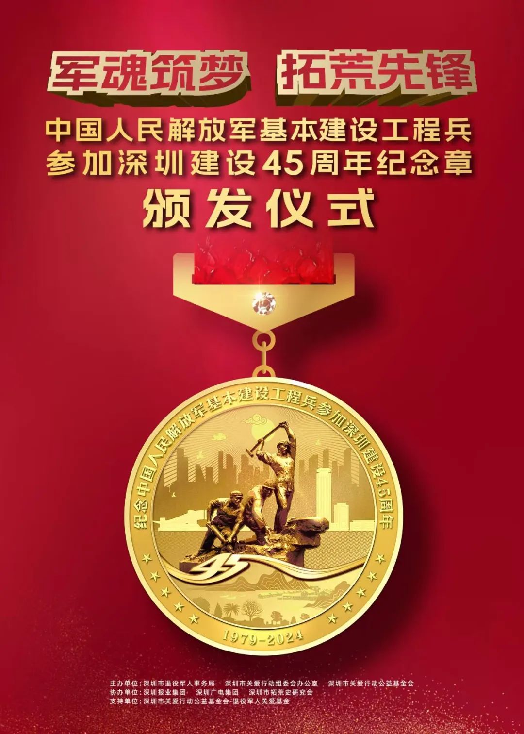 為貫徹落實黨的二十大及二十屆三中全會精神,做好軍人軍屬的榮譽激勵,進一步弘揚深圳的“拓荒牛”精神,在基建工程兵參加深圳建設45周年之際,深圳市退役軍人事務局和深圳市關愛辦、深圳市關愛行動公益基金會特別制作了“中國人民解放軍基本建設工程兵參加深圳建設45周年紀念章”。