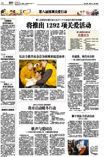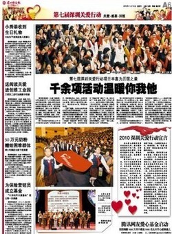 第八屆深圳關愛行動啟動儀式擬于2010年1月12日(星期三)舉辦;“2011·感動深圳”——第八屆深圳關愛行動表彰晚會于2011年4月下旬舉辦。 |